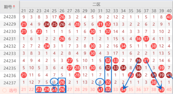 本期的25 31号数字数字是属于遗漏8期的号码,本期遗漏8期的号码有4个为25 31 42 47号数字,是有机会出一个号码的,其中的重点关注一下31 42号数字的出号情况,本期的29 31号数字是属于夹号回补号码,且上期又开出了32号数字,所以本期的31号数字出号机会是很大的。该区间上期开出了26 32 38号数字,本期我们要注意出一个重号的情况,其中的26 32我们可以重点关注一下,本期出一个重号应该是没有问题的。