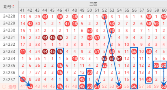 该区间的42 45 48号数字是属于尾数2路号码,已经遗漏3期没有出号了,本期是有机会出一个号码的,其中的42 48号数字我们可以重点关注一下,本期的42号数字是属于39 40 41 42号数字的四斜连号码,48号数字是属于48 49 50号数字的三斜连号码,都是有出号机会的。本期的52 53 54号数字我们要注意出一个号码的情况,毕竟三连号52 53 54号数字空了2期没有出号了,本期应该是会出一个号码来的,我们重点关注一下52 54号数字的出号情况。