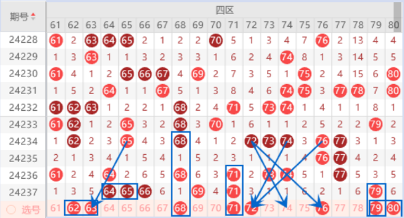 本期的62 63号数字我们要注意出同出的情况,本期的62号数字是属于重号回补号码,63号数字是属于三斜连号码,都是有出号机会的,我们可以防守一下。上期开出了64 65 66号数字,本期不一定会出重号,最好是做一下防守就行了。本期的72 74 76号数字我们注意出一个号码的情况,其中的72 76号数字我们可以重点关注一下出号情况,属于重复交叉对称号码,出一个号码的机会很大。