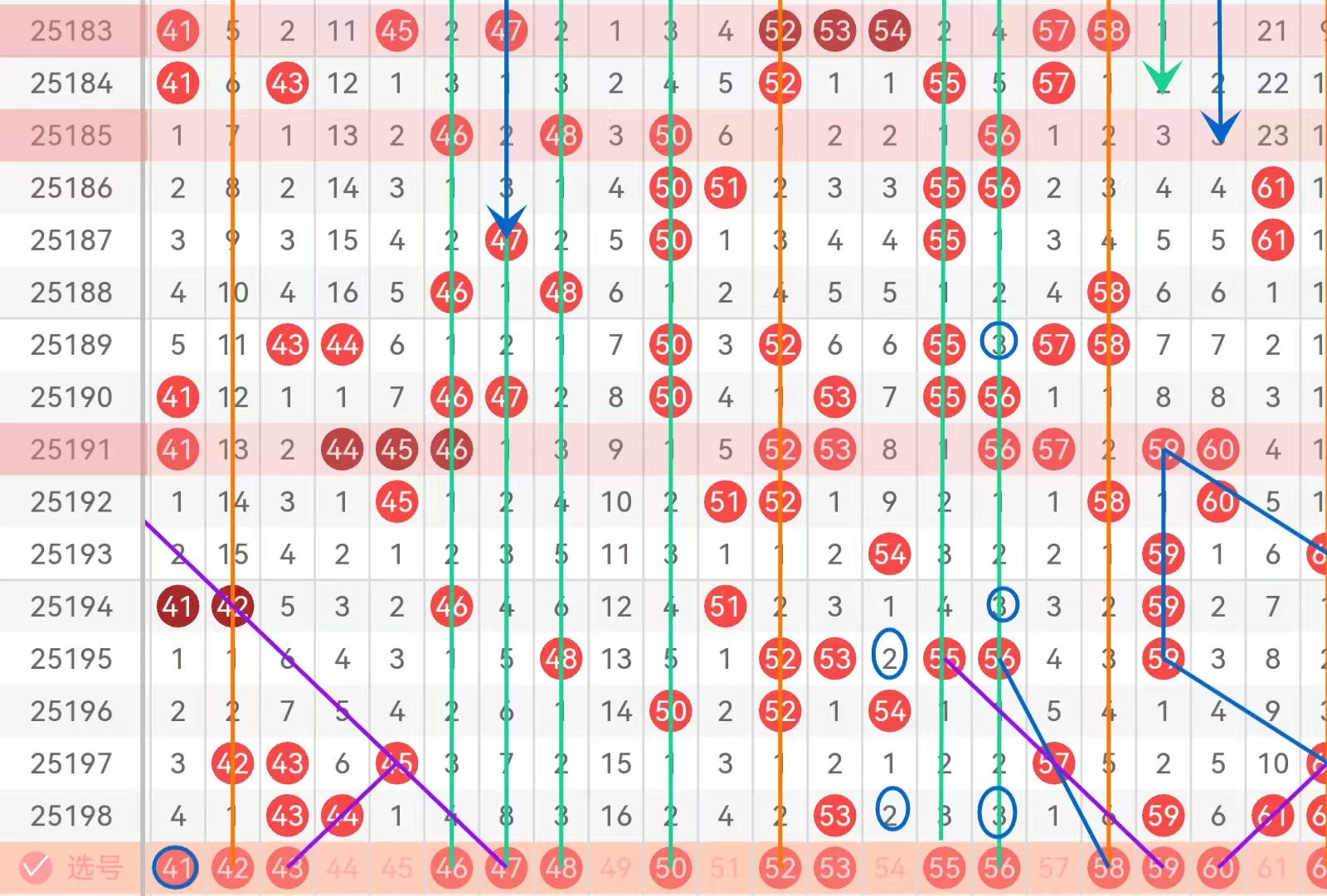 三区间推荐主做号码:47 52 58 59 防守号码:41 43 54 56 60;