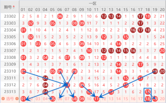 该区间的01号数字,本期我们要注意一下,属于01 04 07的镜像对称号码,出号机会比较大的。连号空一带号05 06 08号数字本期我们要注意回补一个号码的情况,重点关注一下05 08号数字的回补情况。本期的09号数字是属于131走势,我们防守一下05 09同出的情况。本期的11号数字是属于5斜连号码,我们关注一下。三连号19 20 21号数字本期应该是要落号了,本期我们重点关注一下19 21号数字的落号情况。