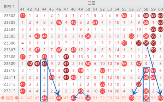 三连号42 43 44号数字会不会像前面的72 73 74一样遗漏道五期才落号,所以本期这里的号码我们就做一下防守就行了,做胆风险还是大的。本期的连号空一带号45 47 48号数字我们要注意回补情况了,重点关注一下46 48号数字的回补情况就行了。上期开出的49号数字,本期我们要注意分边的情况。本期的56号数字是属于遗漏8期的号码,本期遗漏8期的有3个,我们要注意出一个号码的情况。本期的58号数字出重的机会还是有的,我们要注意一下。