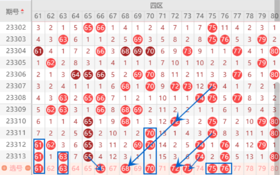 该区间上期开出了61 63 65的空一出号情况,本期我们做一下重号就行了,重点关注一下61 63出重的情况,本期的65号数字应该是走不了5重了吧。本期的68号数字我们关注一下,属于斜四连号码,出号机会还是有的。本期的70 72号数字我们要注意,可以防守一下68 70 72同出的情况。本期的夹号75号数字我们关注一下,还是有机会出来的。