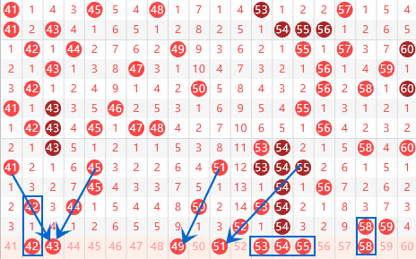 该区间的42号数字我们要注意一下,43号数字本期的热度很大,所以我们就重点看一下42号数字就行了。本期49号数字是属于遗漏9期的号码,本期遗漏9期的号码有3个,最少会出一个号码,我们要注意了。本期53 54 55我们要注意一下,这里有机会出2个号码的。本期的58 59号数字我们要注意走重的情况。
