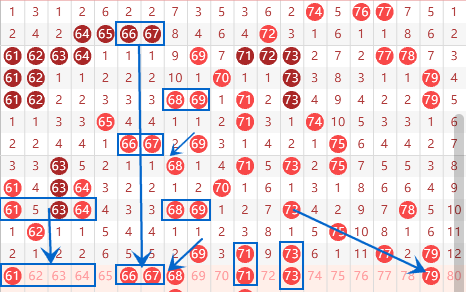 本期的61 63 64我们要注意落号情况,重点考虑一下63 64的出号情况。本期的66 67号数字我们要注意同时落下来的情况。既然上期开出了69号数字,那么本期我们就要注意一下68号数字的出号情况了。本期的69 71 73我们要注意出重号的情况,重点考虑一下71 73的重号情况。