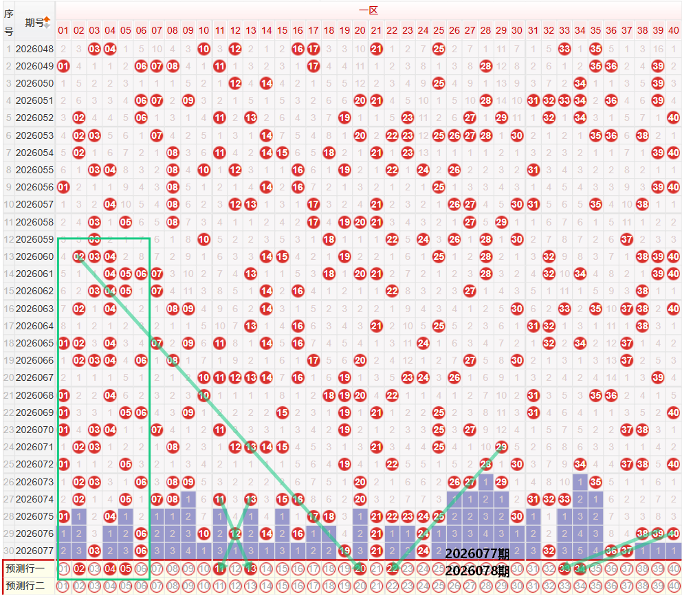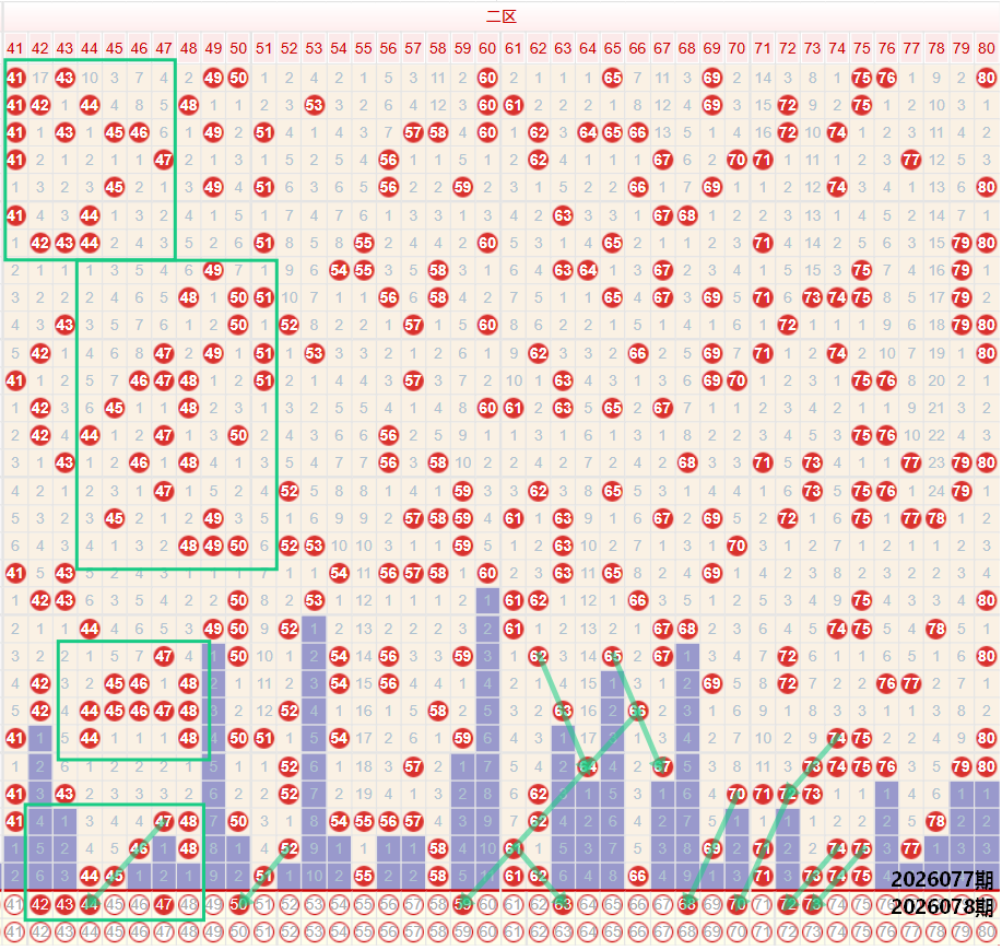 如图所示:在本期大数区的选号中注意在上期的走势中三区间开出了5枚中奖号码,落位在均值水平,上期开出了45的斜线第三期走势,以及44 45的二连走势,本期注意44 45的重号走势,如果考虑44的重号走势,要注意向前的多连码走势,个人较为看好42 43 44的三连号走势,中段位置在上期开出51的第二期走势下方,注意50的第三期走势,同时这里要注意44 47 50的同路三码走势,尾部位置注意58的重号形态向后延续,4区间上期开出了7枚中奖号码,开出了多个重号走势,74 75出现了同步重号走势,以及73 74 75的三连号走势,目前保持着第二期的走势,本期注意第三期延续走势,重点关注73的重号第二期走势,以及68 70 72的偶数三连号走势,前段位置在上期开出61 62的二连走势之后,本期注意68的交替走势,以及63的斜线第三期走势。