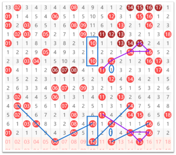快乐8第2026057期01-20区域,推荐的第一个号码06号,大家可以看到02间隔一期给04,再间隔一期给06的间隔一斜连,以及10间隔一期给08,再间隔一期给06的间隔一期走势。然后就是10号上下对称的一个间隔一走势,还有12号上下对称的一个间隔一走势,以及紫色箭头标注的15号一个同形态走势。