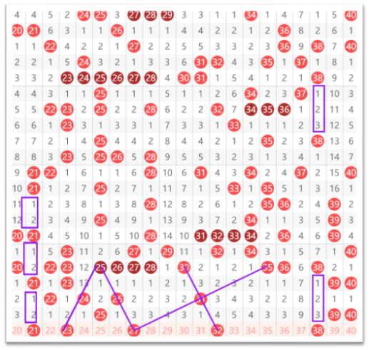 快乐8第2026057期20~40区域,推荐的第一个号码21号,大家看到是一个间隔2的连贯走势,然后就是23和27,大家看到25间隔一给24,再间隔一给23的一个间隔一走势,以及27的间隔一走势,同时看到35斜着31给出27的一个斜连走势,以及32的间隔一斜连,还有38的间隔对称走势,可以看到上面是间隔3,中间间隔7,下面再间隔3。