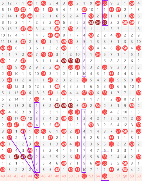 快乐8第2026057期41-60区域第一个号码是45号,本身我们看到是个间隔4,间隔一再间隔4的对称轴,同时我们看到了41斜着开43再给出45的间隔一斜连,以及上面那个43间隔两期,给两个44,再间隔两期给一个45的走势。下面就是52号的间隔10对称走势。最后就是55号,大家看到它上面是一个间隔一,然后重两个间隔6,然后下面也是间隔6,形成一个对称的走势。