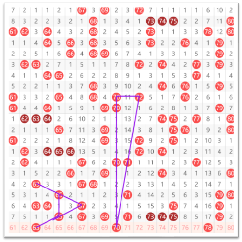 快乐8第2026057期61-80区域的推荐的第一个号码是63号,大家看到上面是63,斜着间隔一给出65,再间隔一给出67,那么回过来,67间隔一给出65,再间隔一给出63的一个走势,同时63又是一个间隔一的走势,昨天开出了69,那么这个70就有很大的开出的可能。然后就是78号,大家看到上面三个79往上给出的就是78,那么下面这个3个79往下开出78的可能性。具体的请大家根据自己的思路和想法去选择。以上是我个人建议。