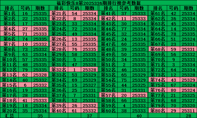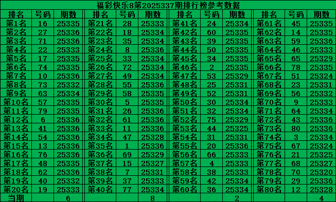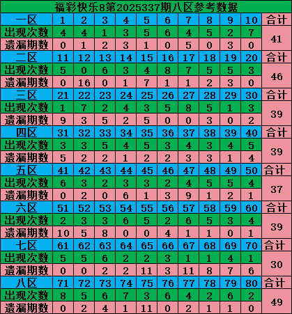 最后再把号码分为四区:一区01-20号、二区21-40号、三区41-60号、四区61-80号,理论上每个区每期应该开出5个号码: