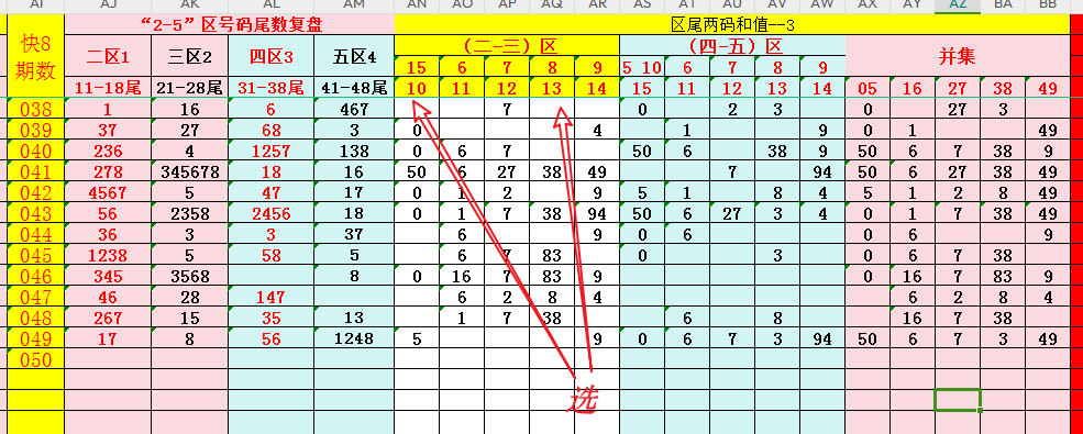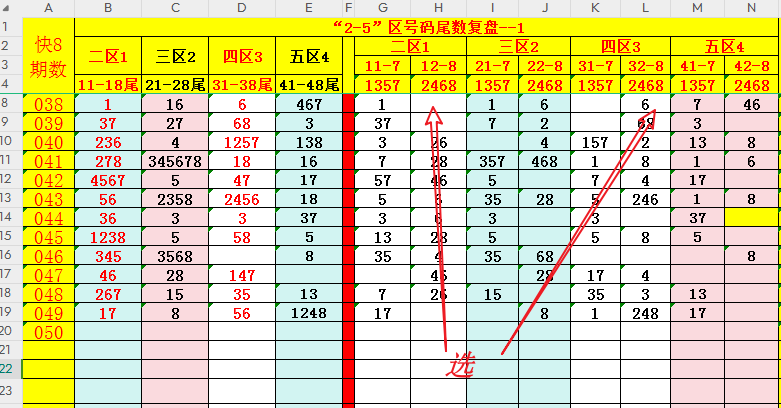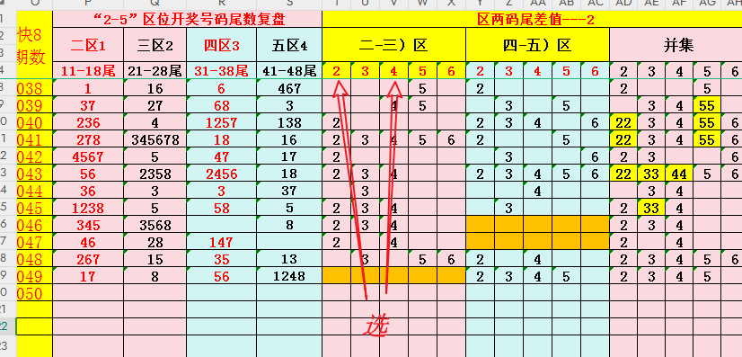 数据复盘是研判号码组合的重要一环。结合专题分析需要,从“八分区”中圈定"2-3-4-5-"四个分区,作为范围号码进行跟踪研判(说明:为了方便分析,只选取1-8的数字尾数,舍弃0-9尾数的号码),复盘如下: