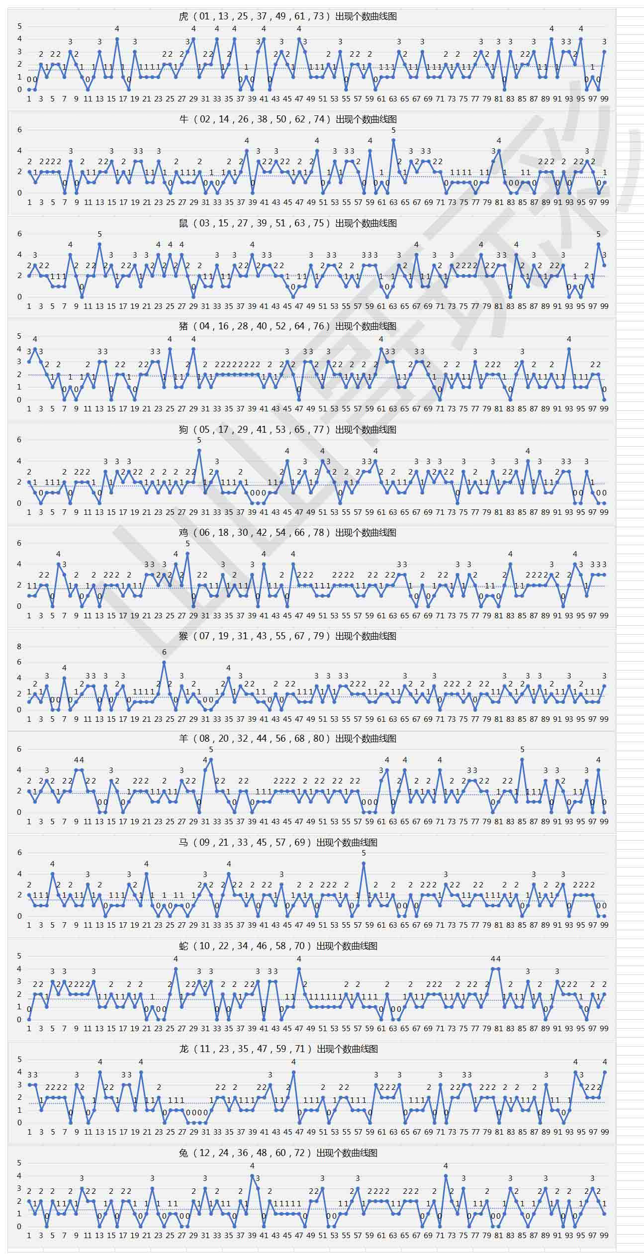 另外,选号的基本原则是:参考别人,相信自己。我把12生肖近期开出的号码个数整理成了曲线趋势图,方便大家对照选择,如下: