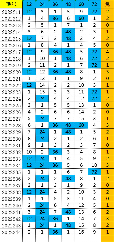 最后来看一下生肖兔(12,24,36,48,60,72)的走势图,如下: