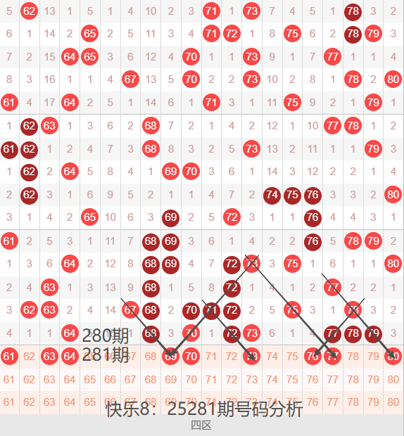 上期该区间开出号码:64 68 70 72 73 77 78 79,8个号码球,区间呈现热开,四区间整体来说太不稳定,该区间也是经常冷一下,热一下,前端和后端也是经常拉扯,双方经常交替落码,选号时,还是谨慎一些比较稳妥,本期个人四区间预选号码:61 63 64 69 70 73 76 77 80,61号是遗漏4期的号码,63号是遗漏1期的号码,64号本期看重码的机会,69号是遗漏3期号码,双线斜连的夹角位置,70号本期看三重吗的机会,73号本期看重码的机会,三斜连哦组是,76号是遗漏4期号码,三斜连落位点,77号本期看重码的机会,80号是四斜连落位点,遗漏3期的号码,通过以上分析,四区间终选号码:63 64 69 73 76 77 80。