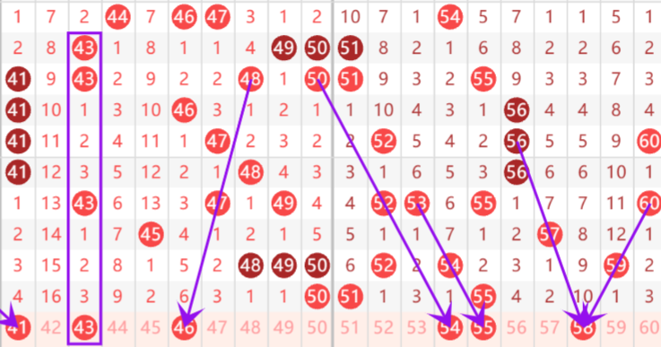 上期三区号码开出50 51 55三个号码,三区间整体热度下滑,本期三区间热度上升,预计开出号码四五个左右,三区间本期重点号码推荐,重号重点推荐55,邻号重点推荐关注54 ,孤号重点推荐关注41 43 46 58