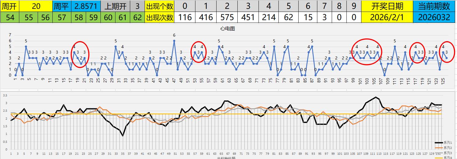 今天来关注一下9码组合(54,55,56,57,58,59,60,61,62),心电图如下: