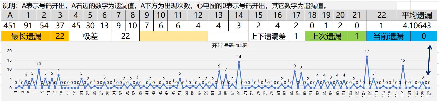 当前遗漏0,表示上期这9码组合就开了3个号码了。历史上这9码开3个的组合,合计开了451次,平均大概每4.11期就会出1次。而从遗漏12开出后开始的本轮长周期,期间最长遗漏仅为3,且只有1次,上一轮(17-12)长周期,期间最长遗漏也仅为5,所以可以一直跟到遗漏5,到遗漏5还是不开,说明趋势已反转,到时什么时候开就不清楚了。