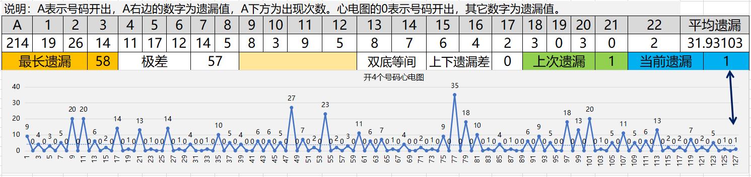 当前遗漏1,表示已经有1期未开4个号码了。而上上期遗漏1,形成了双底(1-1)对称等间周期。历史上遗漏1开过19次,遗漏榜排名第2,倒是遗漏2开了26次,排第一。从图形上看,也未出现(1-1)走势,最低遗漏都是(1-5),所以短期内能否开4个比较难确定,只能说希望还是有的。就像有句话说的,不是看到了希望才去坚持,而是坚持到底才会有希望。永远都相信美好的事情即将发生!
