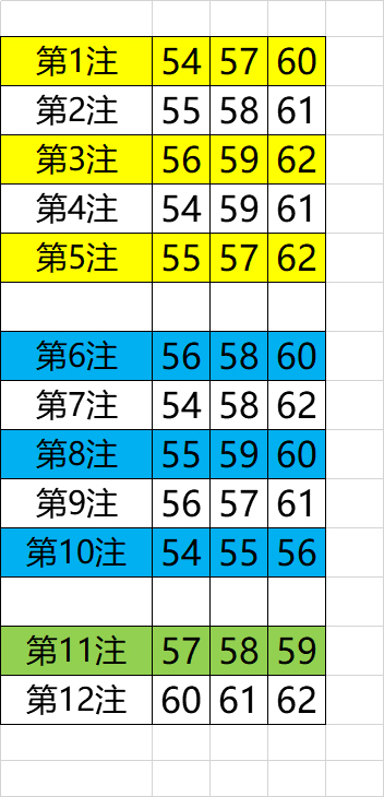 投注策略依然是采用矩阵打法,9码可以选择选3,中2保2,矩阵组合是12注,如下: