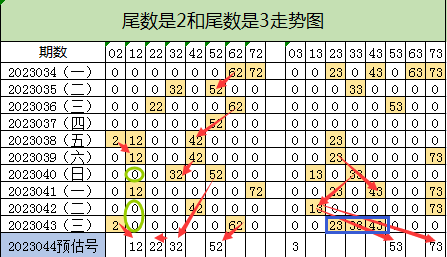 上期开奖号码尾数3和4开出三连号23,24,33,43,