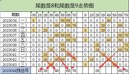 看到尾数43斜开53二连号的话会走出一个小特色连号头尾数隔期斜开走势,而且在042期号