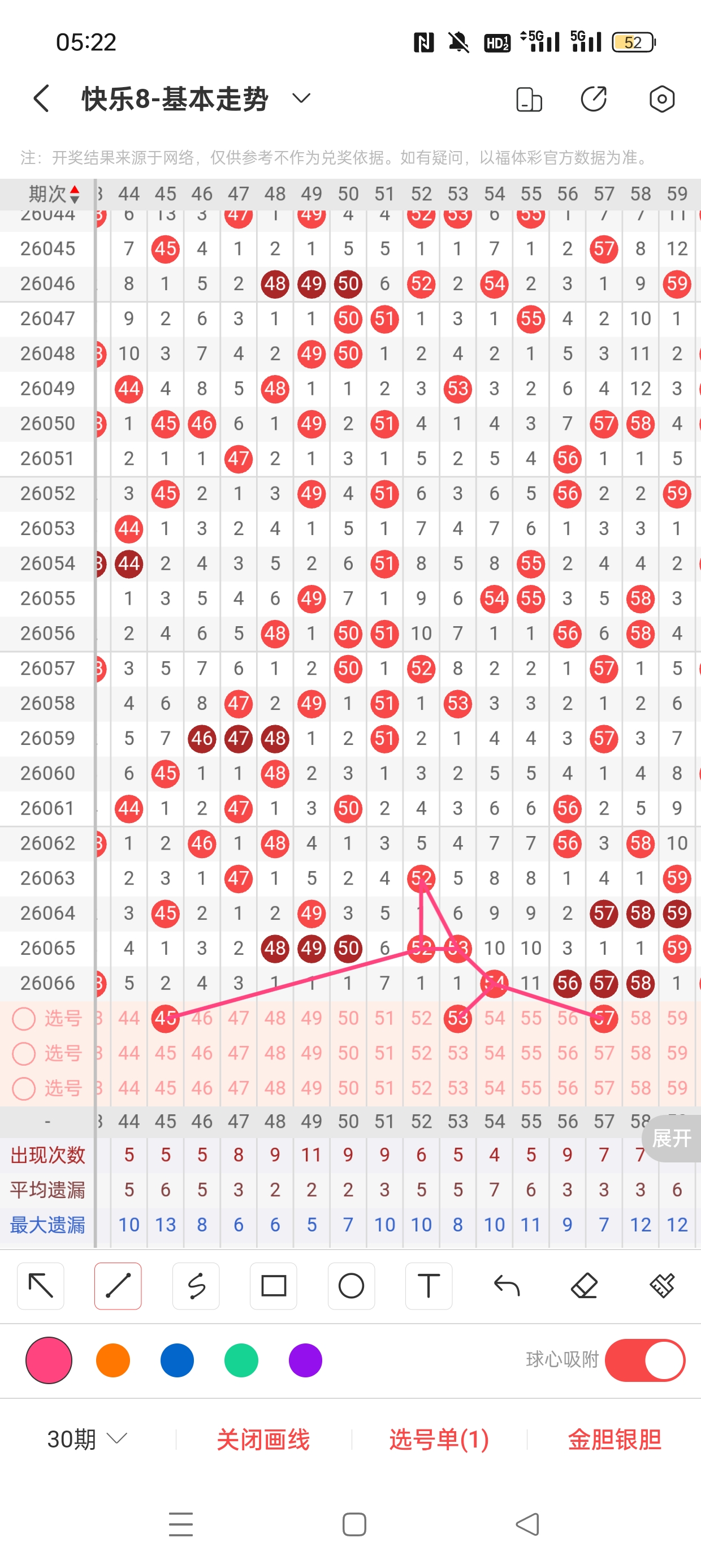 三区(41-60)近五期本区奇偶比44:43,奇数热度高,本期着重偶数。近五期本区和值:232:222:221:220:219,和值下降,本期着重下降,取中间值218,近六期本区区间比:5:5:3:5:6:7,近两期出号个数为13,本期着重出号个数为5。近五期本区同尾号比值为2,本期着重同尾比值为2。45已遗漏2期,与52之间呈现向左遗漏递减态势,需防。53已遗漏1期,与54之间呈现向左遗漏递减态势,需防。57作为传号,与54之间呈现向右遗漏递减态势,需防。