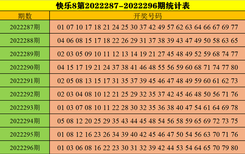 快乐8 第2022296期开奖号码:01 03 06 08 16 22 23 30 31 32 39 42 44 53 54 64 65 70 79 80,大小比9:11,奇偶比8:12,四区比为5:6:4:5,012路比6:7:7,质合比6:14,和值762,跨度79,本期看好和值开在806区段。