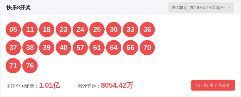快乐826109期开奖结果05 11 18 23 24 25 30 33 36 37 38 39 40 57 61 64 66 70 71 76,和值824,质合比6:14,四区比3:10:1:6,大小比7:13。