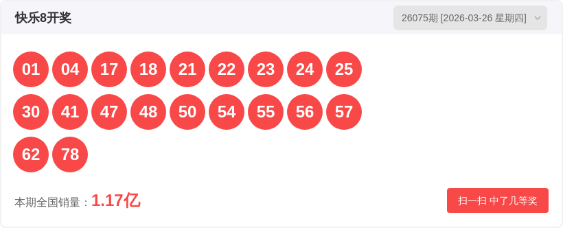 快乐826075期开奖结果01 04 17 18 21 22 23 24 25 30 41 47 48 50 54 55 56 57 62 78,跨度77,大小比10:10,质合比5:15,四区比4:6:8:2。