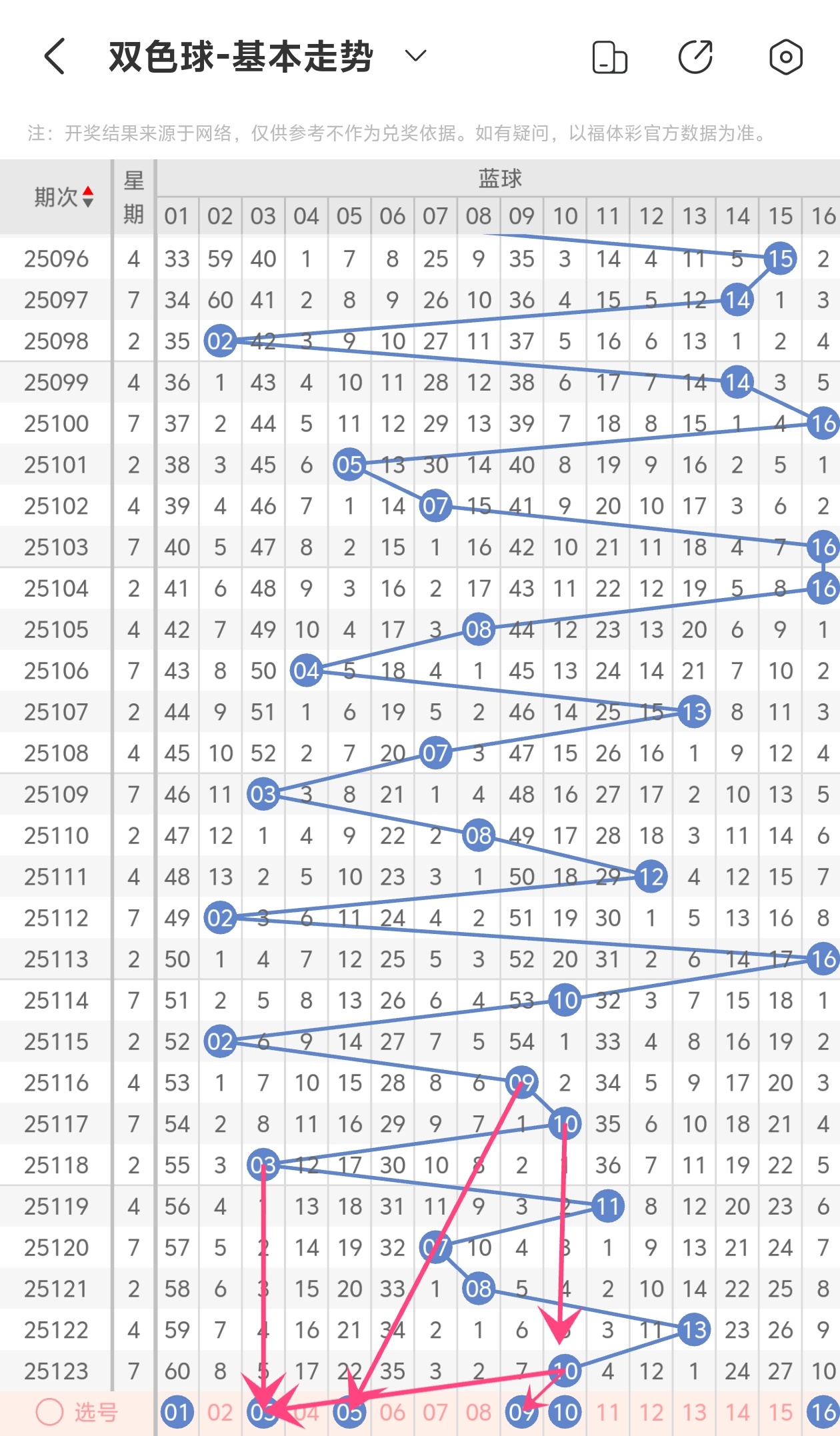 上期蓝球开出10,本期我们可以从上面走势图中看到选号的思路,05为斜连走势, 09为分边走势,10为重码走势,13为斜连走势,综合以上分析本期蓝球推荐01 03 05 09 10
