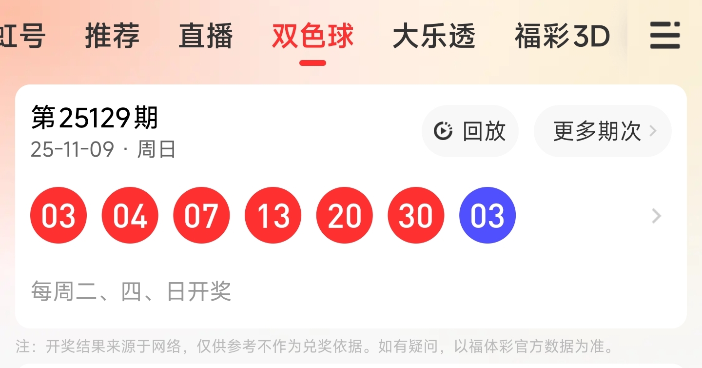 第25129期双色球文章中推荐中命中3,13,20,30等4个红球。