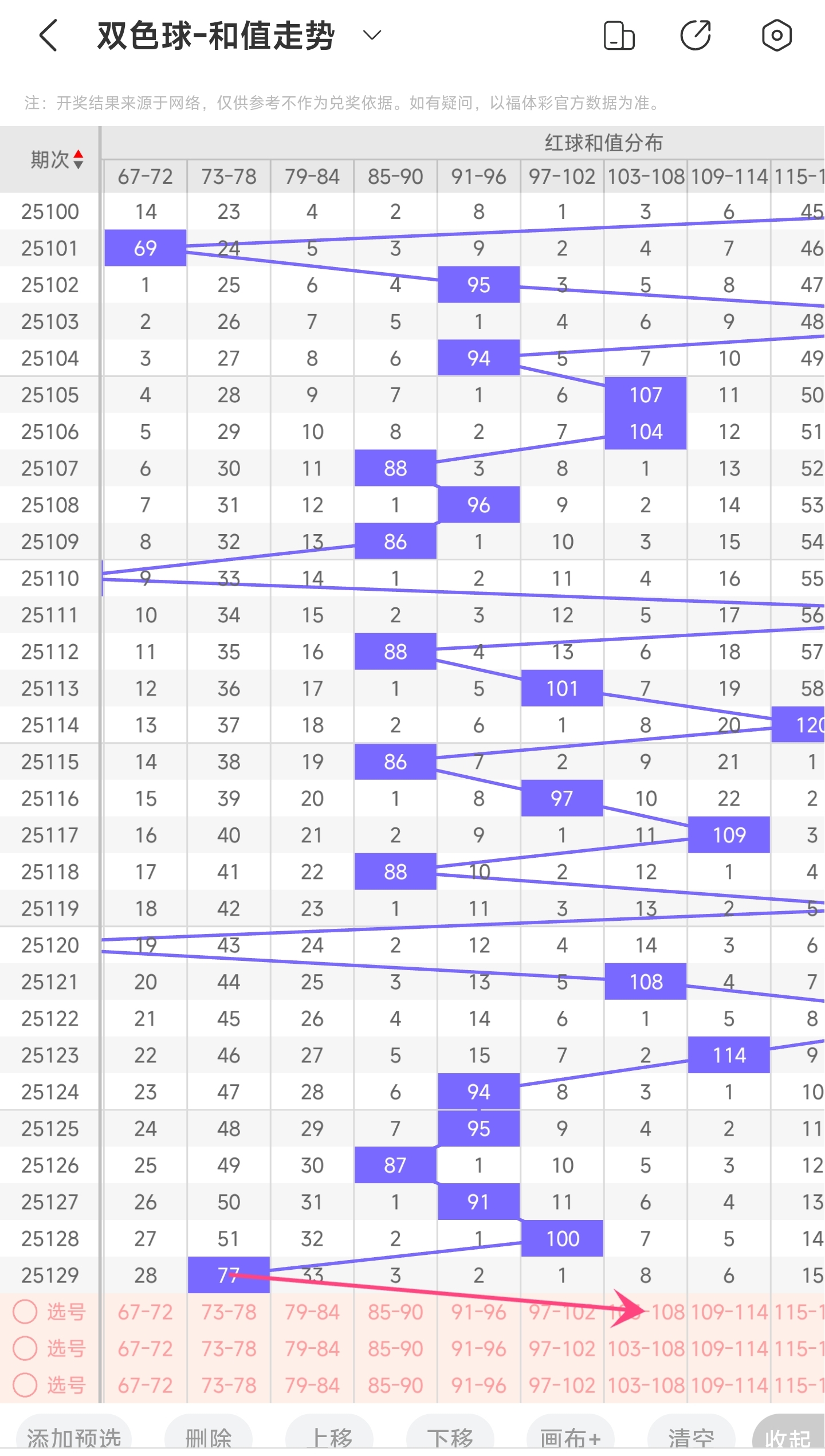 上期和值为77,而近5期和值为95,87,91,100,77均值90,上期和值较前一期减少了23,振幅为23。77和值是属于近30期内开出的比较小的和值,下降的空间比较小,上升的空间比较大。所以推测本期和值趋势是大概率往右,和值变大,极小概率继续往左,和值变小。
