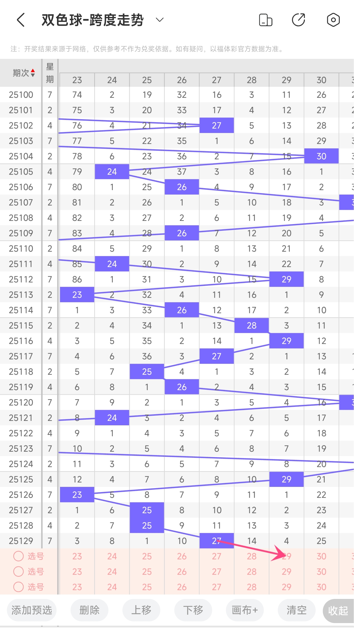 上期龙头为3,凤尾为30,跨度为27,往前一期跨度是25,偏移量为2。27跨度值是30期内开出的比较中间的跨度值。还有上升的空间,本期看好大跨度值,所以推测本期跨度趋势是往右,跨度变大,小概率往左,跨度值变小。
