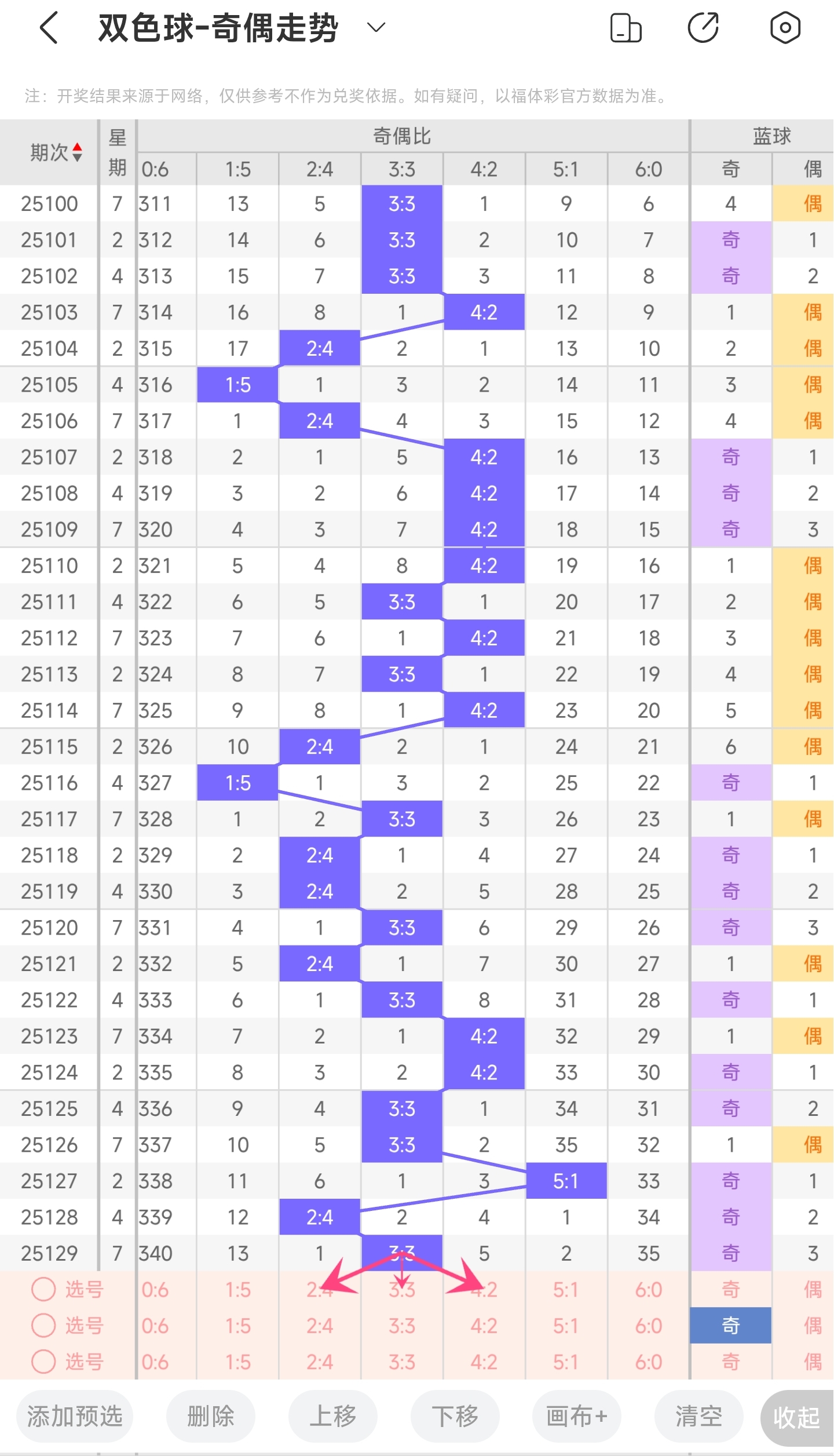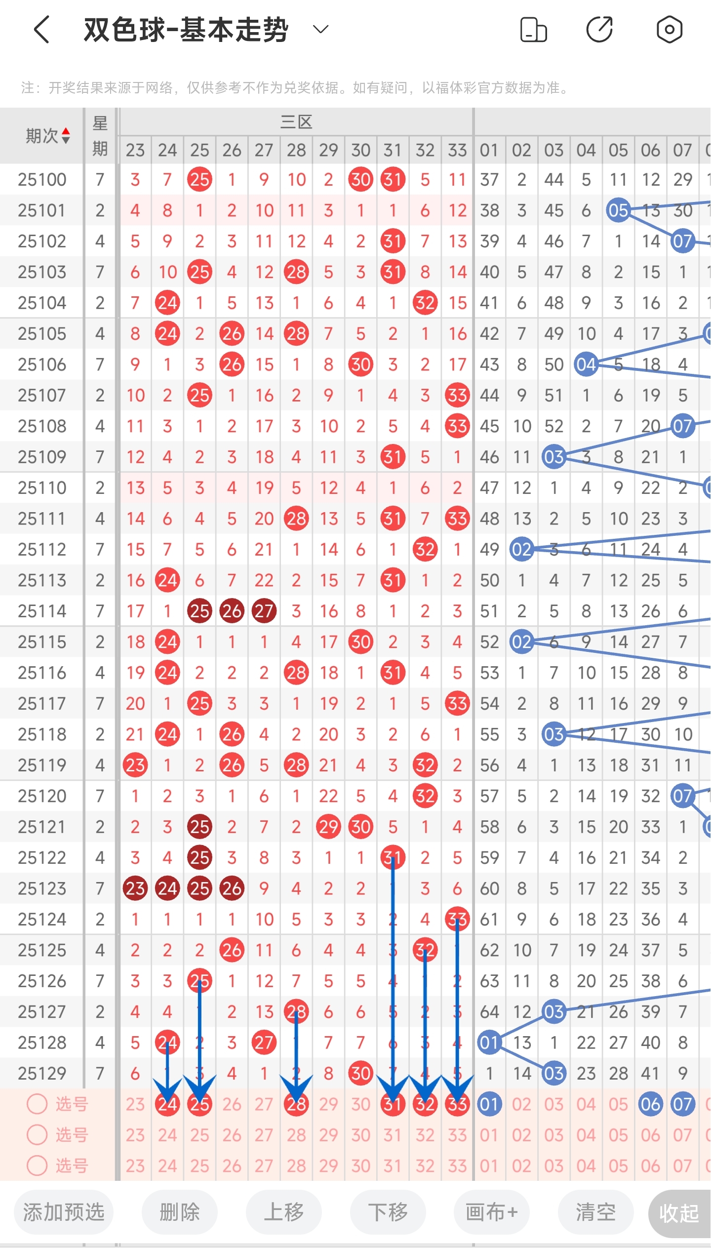 上一期三区开出了30号球。往前一期出了24和27号球。通过走势图分析,可以看到凤尾回补到了比较右边的位置,本期有可能继续开在右边,可以关注一下,但也可能又开回中间或者左边,也要关注一下,所以本期我们比较均匀关注一下左中右的号码。最后再结合冷热号和遗漏期数,本期我们可以关注24,25,28,31,32,33等号。综上所述本期我们推测有可能开出24,25,28,31,32,33等号码。