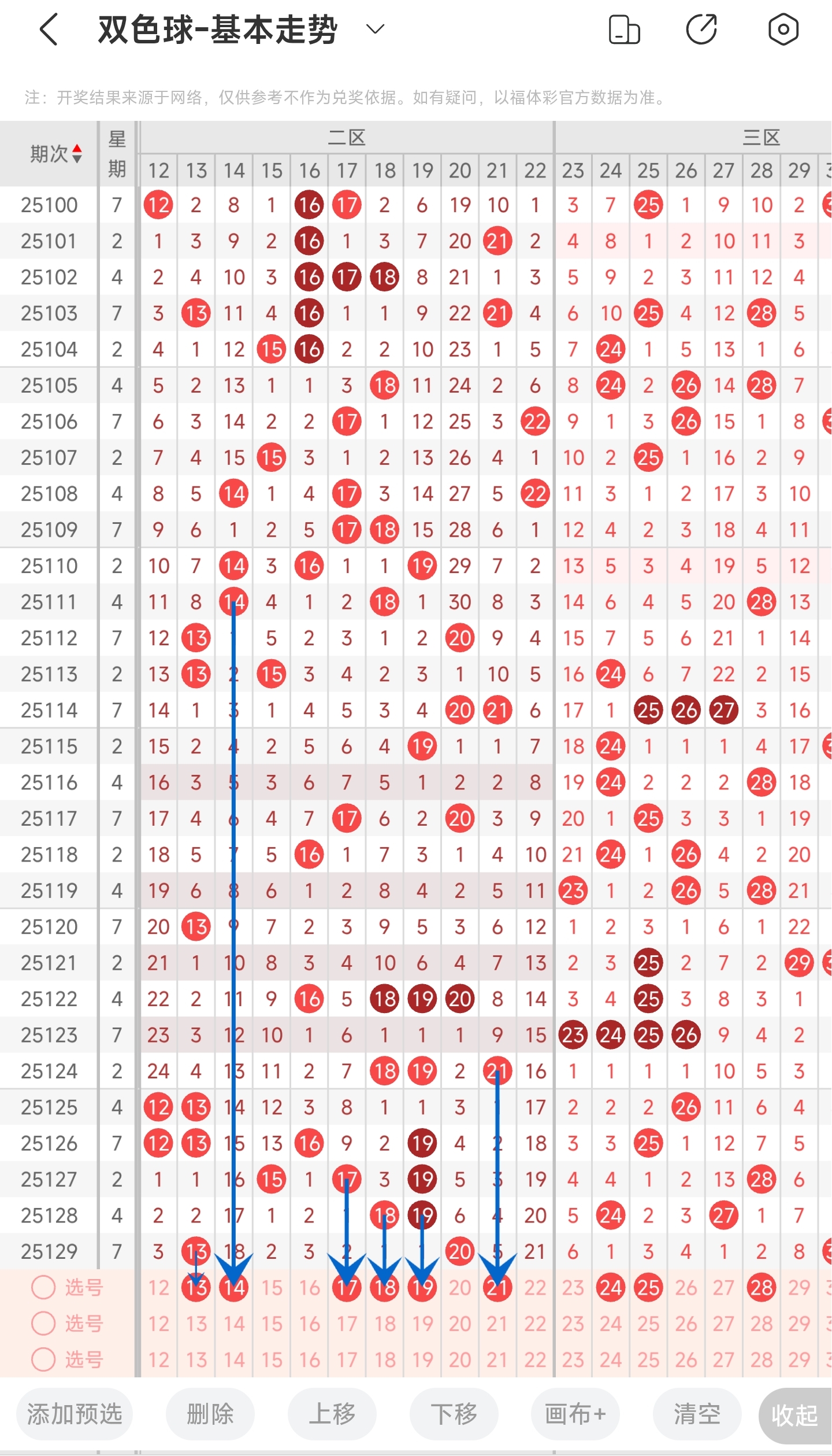 上一期二区开了13,20号球。往前一期开了18,19号球。通过分析走势图,可以看到上期开了一左一右,右边的号码比较靠近中间,所以中间以及偏右边的号码依旧比较热门,本期继续关注中间和右边的号码,然后再防一下左边的。最后再结合冷热号和遗漏期数,本期我们可以关注一下13,14,17,18,19,21等号码。综上所述推测本期可能开13,14,17,18,19,21等号码。