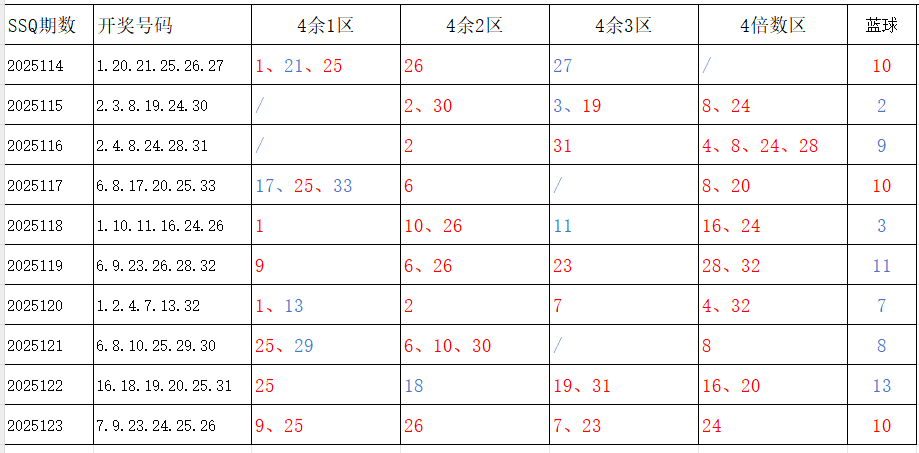 首先看上期回顾,双色球2025123期开奖结果:7.9.23.24.25.26+10。其中红球号码开出:4余1区号码1个,4余2区号码1个,4余3区号码2个,4倍数区号码2个。蓝球号码:冷号回补。再看上期个人分析:胆尾中出3尾3码!蓝球杀号全对!大底号码中3+1!恭喜中出的虹友!