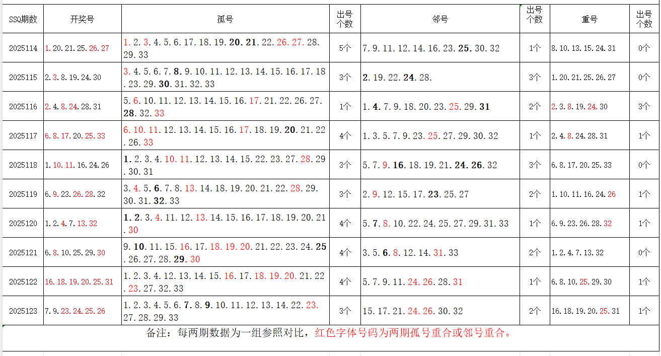 如图,以近两期数据为一组,进行对比分析。相同的孤号、邻号,可能在下期出1-4个左右。上期开出孤号3个,邻号2个,重号1个。本期参考孤号:1.2.3.4.5.11.12.13.14.1516.17.18.19.20.21.28.29.30.31.32.33;邻号:6.8.10.22.27;孤、邻号重合号码精选:***(会员专区可见)。个人分析,仅供参考。