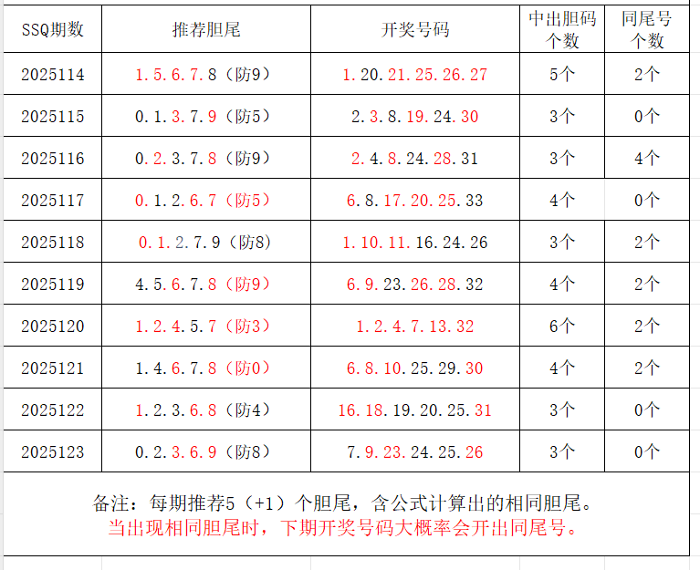 如图,每期推荐胆尾中出1-4个。上期推荐胆尾中出3尾3码!推荐胆尾是按照公式计算的顺序,不定位红球号码的顺序。本期推荐胆尾:3尾/7尾/8尾/9尾/1尾 。加推重点胆尾:***(会员专区可见)。推荐胆码号码:***(会员专区可见)。个人分析,仅供参考。