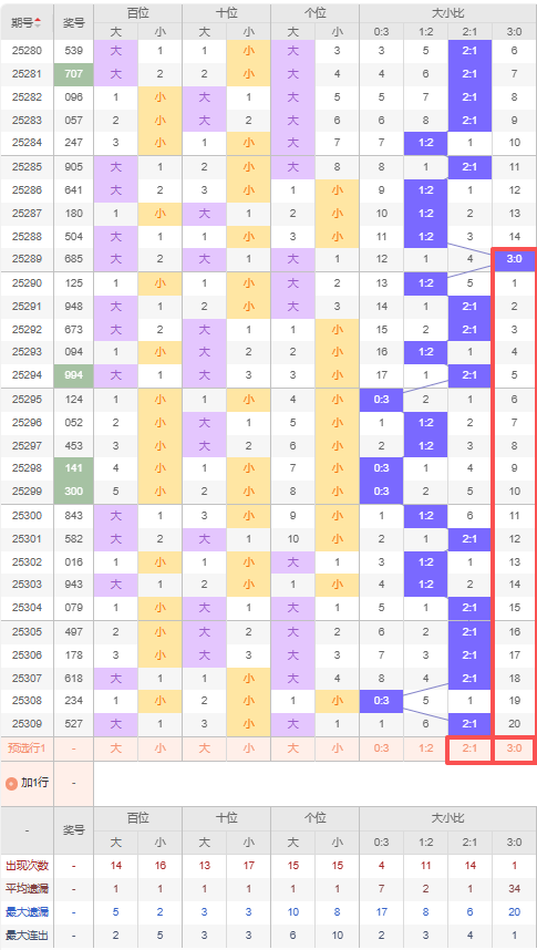 上期大小比:2:1,近10期大小比出现情况:1:2、2:1、1:2、1:2、2:1、2:1、2:1、2:1、0:3、2:1,最近10期出6期2:1,出现3期1:2,出现1期0:3,出现0期3:0,根据近10期出号规律本期推荐遗漏20期的3:0,防连出2:1,综上所述大小比推荐:防:2:1,重点关注:3:0。