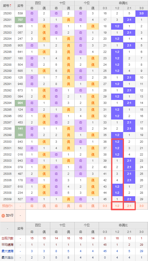 上期奇偶比:2:1,近10期奇偶比出现情况:1:2、1:2、1:2、2:1、2:1、2:1、2:1、1:2、1:2、2:1,最近10期出现5期2:1,出现5期1:2,出现0期0:3,出现0期3:0,根据近10期出号规律本期推荐隔期出1:2,防连出2:1,综上所述奇偶比推荐:防:2:1,重点关注:1:2。