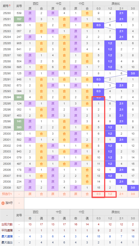 上期质合比:3:0,近10期质合比出现情况:1:2、2:1、1:2、1:2、1:2、1:2、2:1、1:2、2:1、3:0,最近10期出现3期2:1,出现6期1:2,出现10期0:3,出现1期3:0,根据近10期规律本期推荐遗漏15期出0:3,防遗漏2期出1:2,综上所述质合比推荐:防:1:2,重点关注:0:3。