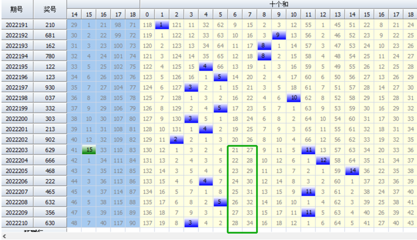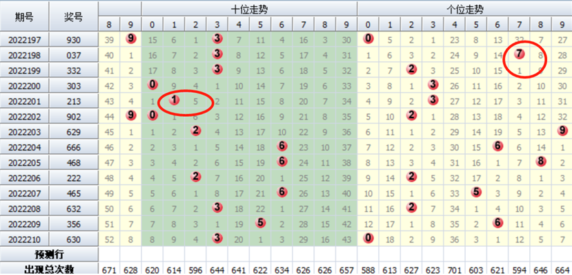 我们通过上图可以看到2022198期开出037,当期开出了个7,2022201期开奖213,中位开出号码1,从此以后我们就能看到排三开奖号码里中位和个位上1路号码彻底消失了,长达了9期,这个遗漏期数其实已经非常惊人了。