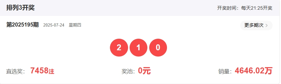 排列三第2025195期开奖回顾:开奖号码:210 形态:组六