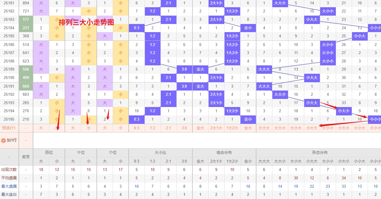 排列三 大小形态分析:从大小走势图上可以看出排列三100期内百位大小比约为49比51,十位大小比约为46:54,个位大小比约为53比47,除了百位和十位奇数比偶数多,个位是偶数比奇数多。历史数据近2期开出小小小下一期的走势为,第097期开出小小小第098期开小大小。第105期开出小小小后第106期开大小大,第117期开出小小小后118期开小小大。可以看出开出小小小的时候,结合遗漏数据再加上开出小小小形态后容易进行下一个类型变化。近期排列三大小走势中,"大小大"、"小大小"和"小小大"组合集体陷入冷态,遗漏周期均已超出历史平均水平,回补需求强烈。其中"大小大"组合已连续多期未见,冷态最为显著;"小大小"和"小小大"组合也持续低温运行,形成罕见的"三冷齐发"局面。从概率分布来看,这类冷态组合的回补往往具有联动性,一旦启动可能形成轮动出号。所以排列三第2025196期大小形态推荐大小大防小大小。本文由一起彩钱是生命动力所著,请勿转载