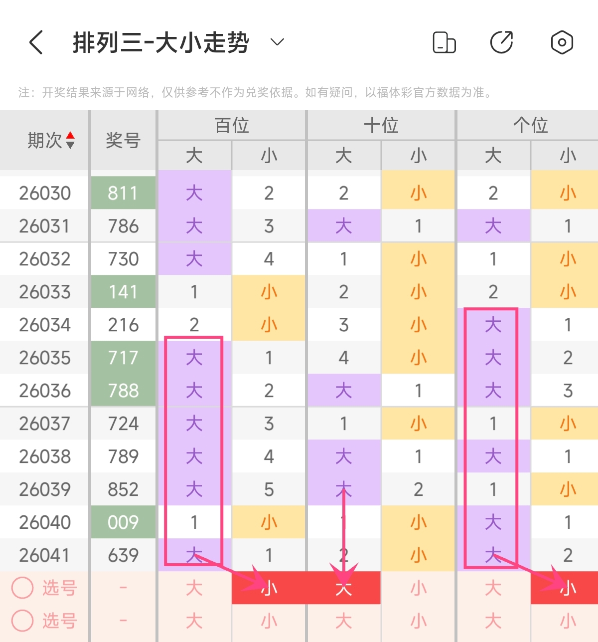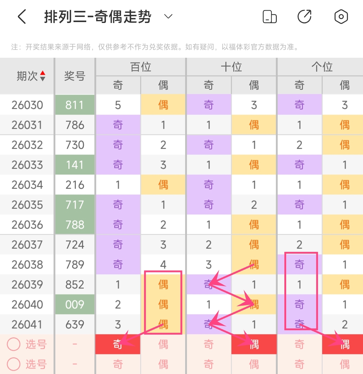 首先让我们回顾一下上期排列三第2026041期开奖号码为639,为组六形态,大小比为2:1,奇偶比为2:1,跨度为6,和值为18。