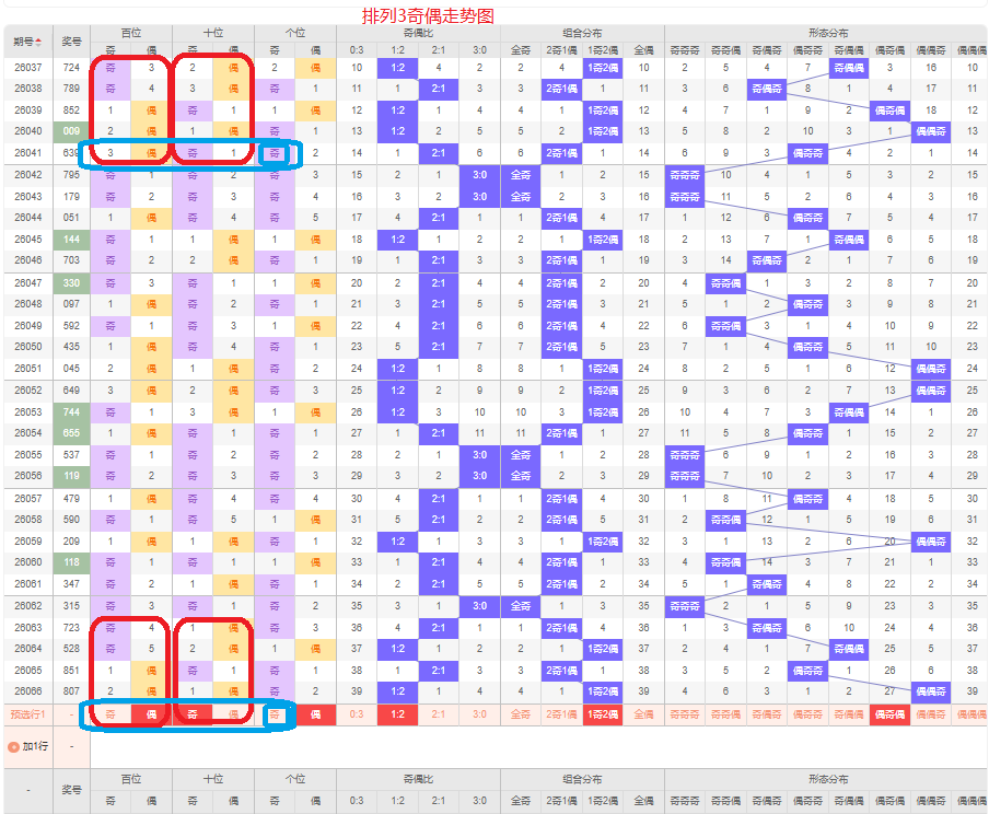上一期的奇偶比为1:2,两偶的号码组合,从近五期的奇偶数出现情况看,奇数出9次,偶数出现6次,奇数号码出现较多,本期要侧重两偶的号码组合,侧重偶奇偶或奇奇奇的号码组合,根据奇偶组合形态可做五码定位02468/13579/02468或13579/13579/13579