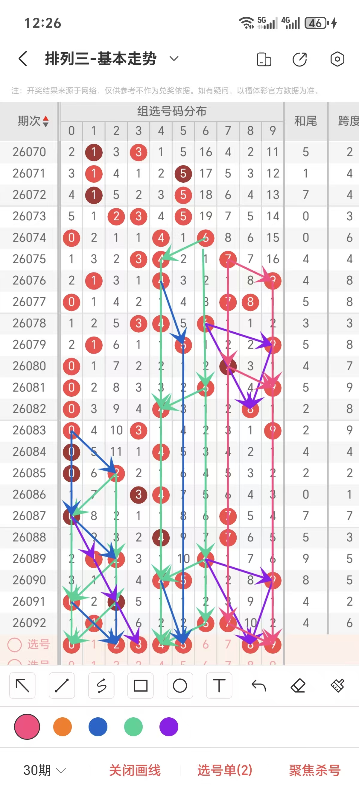 通常情况下在五期之内重复一个跨度的概率较高,近五期重复了5的跨度,近五期跨度为3/5/5/2/6,近期02路的跨度较热,本期要侧重4/5/7跨为主的号码组合。选择好跨度就可以从跨度方面选择相应的双胆码组合,双胆码的选取要根据近期和历史的走势进一步的分析选取。