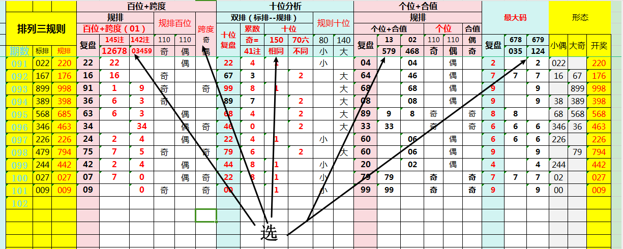 规则排列中,根据“十位”数字奇、大小律特征,与标准排列的十位数字并集分析,其中十位数字相同的150注,不相同的70注,这一特点具有实用价值。