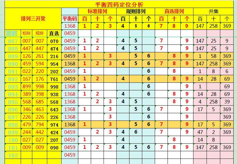 规则排列中,“百位与跨度并集分析,复盘数字分12678-03459两组,容错01、排除豹子10注、小概率十个差89的10注;并集12678第一大底145注,并集03459第二大底142注;两者比较选择,具有较高参考价值。
